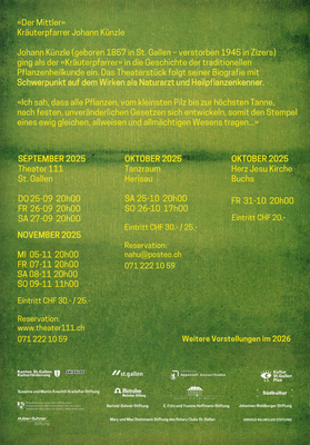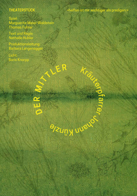 Das Stück "der Mittler - Kräuterpfarrer Johann Künzle" spannt den Bogen von der Kindheit des "Kräuterpfarrers" Johann Künzle in St.Gallen bis zu seiner letzten Wohn- und Wirkstätte als angesehener, weltberühmter, jedoch auch umstrittener Naturarzt in Zizers. Pflanzenportraits ergänzen die biografischen Elemente. Gerade in unserer hochtechnisierten Zeit spiegelt das Stück das Bedürfnis vieler Menschen sich nach einem gesünderem Lebensstil und den Kräften der Natur auszurichten.